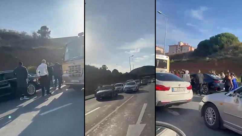 Maltepe'de düğün konvoyu yapan bir grup, otoyolda iki şeridi trafiğe kapatıp müzik eşliğinde horon oynadı. Trafikte aksamalar meydana gelirken, o anlar bir sürücünün cep telefonu kamerasına yansıdı.