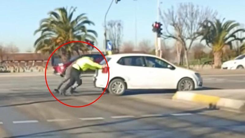 Olay, saat 09.00 sıralarında Mimar Sinan ışıklar mevkiinde meydana geldi. Edinilen bilgiye göre sahilyolunda bir otomobil hasarlı kazaya karıştı. Olay yerine gelen trafik polisi A.B. kaza sonrası arızalanan aracı, trafiğe engel olmaması için park görevlisiyle iterek yol kenarına aldı. O anlar cep telefonu kamerasına yansıdı.