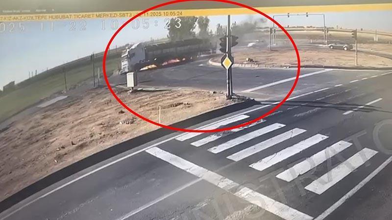 Mardin'in Kızıltepe ilçesinde 2 TIR ile 1 cipin karıştığı kazada, TIR alev aldı. Kaza güvenlik kamerasına yansırken, TIR'da çıkan yangın söndürüldü.