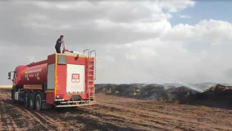 Mardin'in Artuklu ilçesinde tarlada istiflenen 70 ton saman balyası yandı.