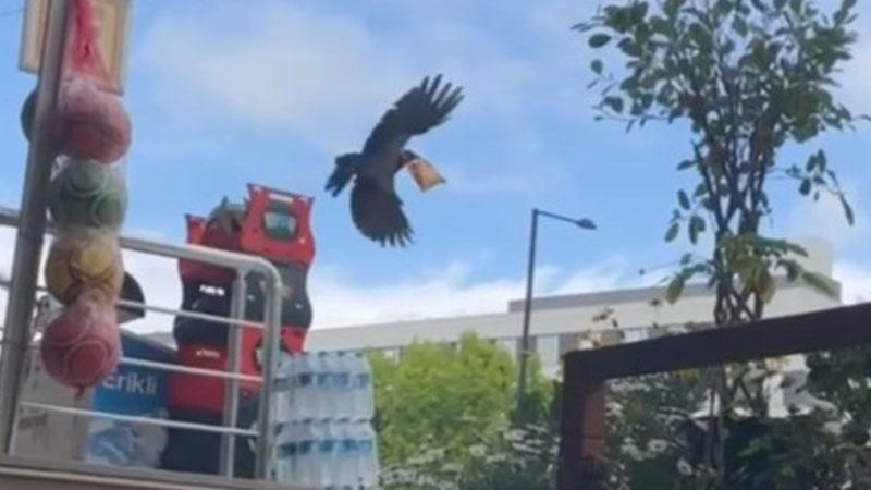 Sancaktepe'de market önündeki cipsi alıp götüren kargayı cep telefonu kamerasıyla kaydeden esnaf, 'Çok acılı alma yakar seni' diyerek kargayı uyardı.