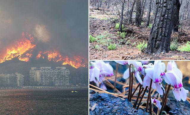 Aradan geçen 90 gün süre içinde yüksek tepe ile yerleşim yerlerine yakın alanlarda zarar gören ağaç diplerinde bitkiler çıkarak büyümeye başladı. Yeşil bitki örtüsünü fark eden Marmarisliler fotoğraf ve video çekti. Yangın nedeniyle griye dönen topraktan 'Siklamen' ve 'Güz çiğdemi' çiçekleri açtı. 50 ile 1500 metre yüksekliklerde yetişen çiçekler görenleri mutlu etti.