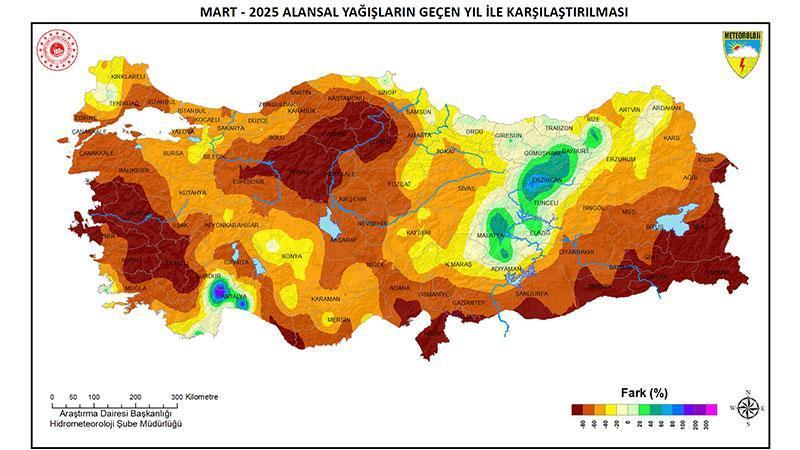 Meteoroloji Genel Müdürlüğü'nün '2025 Yılı Mart Ayı Alansal Yağış Raporu' verilerine göre Türkiye geneli mart ayı yağışı normali ve geçen yıl mart ayı yağışının altında gerçekleşti. 1991-2020 yıllarını kapsayan normali 61,2 mm olan yağışlar, 2024 yılı Mart ayında 69,5 mm, bu yıl mart ayında ise 28,8 mm olarak kaydedildi. Yağışlarda normaline göre yüzde 53, geçen yıl mart ayı yağışına göre yüzde 59 azalma meydana geldi. Mart ayı yağışları, 35 yılın en düşük seviyesine indi.