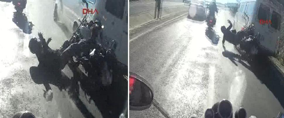Minibüse çarptı arkadan gelen motosikletin altında kalmaktan son anda kurtuldu