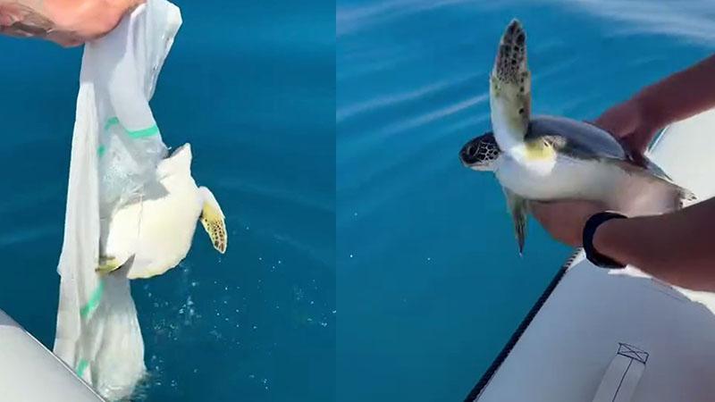 Antalya'nın Alanya ilçesinde amatör balıkçılar, tekneyle açıldıkları denizde misina ve çuvala dolanmış halde buldukları yavru deniz kaplumbağasını kurtarıp, suya bıraktı.
