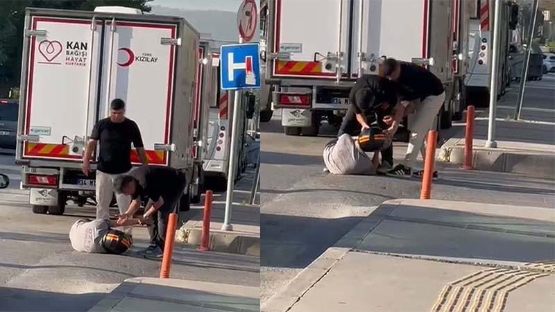 İzmir'in Bayraklı ilçesinde motosiklet sürücüsü A.P.'nin 2 kişi tarafından darbedildiği anlar cep telefonu ile kaydedildi.