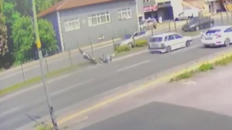 Motosiklet tellere çarpıp takla attı; kaza anı kamerada