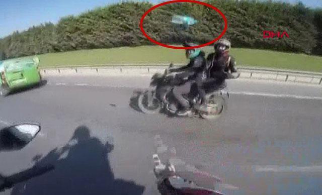 Basın Ekspres bağlantı yolunda geçtiğimiz günlerde seyir halinde olan 2 motosiklet sürücüsü birbirine pet şişe fırlattı. Trafikte yaptığı tehlikeli oyunlarla sürücülerin canını tehlikeye atan motosikletliler o anları kaydettirip bir de sosyal medyada paylaştı.