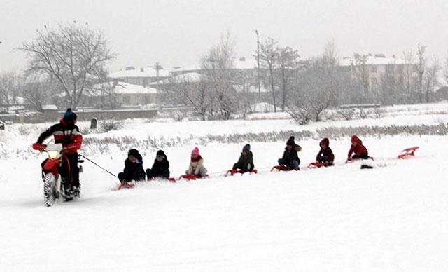 Kar kalınlığının 20 santimetreye yaklaştığı kentte çocukları eğlendirmek isteyen Canser Atila, Demirkent Mahallesi'nde 8 kızağı motosikletine bağladı. Kızağa bindirdiği çocukları motosiklet ile çeken Atila, ilginç yöntemi ile keyifli anlar yaşattı.