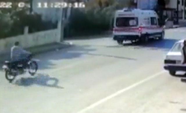 Antalya'nın Gazipaşa ilçesinde Nusret Özdemir (24) doğum sancısı başlayan eşini hastaneye götüren ambulansın ardından motosikletiyle giderken otomobille çarpışıp yaralandı. Özdemir'in ambulansı takip ettiği anlar, güvenlik kamerasına yansıdı.
