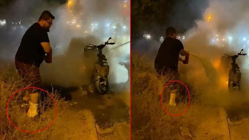 Motosikletteki yangına kırık bacağıyla müdahale etti; o anlar kamerada
