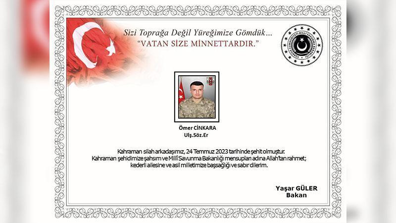 Bakanlıktan yapılan yazılı açıklamada, "Özalp, Van'da 24 Temmuz 2023 tarihinde silah kazası sonucu yaralanarak derhal hastaneye sevk edilen kahraman silah arkadaşımız Ulaştırma Sözleşmeli Er Ömer Cinkara yapılan tüm müdahalelere rağmen kurtarılamayarak şehit olmuştur. Bizleri derin bir acı ve üzüntüye boğan bu olayda hayatını kaybeden aziz şehidimize Allah'tan rahmet, kederli ailesine, Türk Silahlı Kuvvetleri ile asil milletimize başsağlığı ve sabır dileriz" denildi.