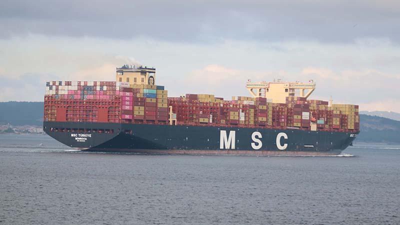 Dünyanın en büyük konteyner gemilerinden olan ve Cumhuriyet'in 100'üncü yılı anısına 'MSC Türkiye' adıyla denize indirilen gemi, Çanakkale Boğazı'ndan geçerek Kocaeli Limanı'na doğru yol aldı.