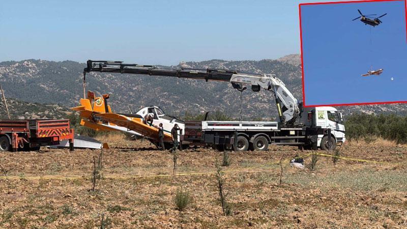 Denizli’nin Buldan ilçesinde çıkıp, Aydın'ın Buharkent ilçesine sıçrayan yangına müdahale ederken Muğla'nın Yatağan ilçesinde kaza kırıma uğrayan uçak, yapılan incelemelerin ardından askeri helikopterle alınarak Ankara'ya götürüldü.