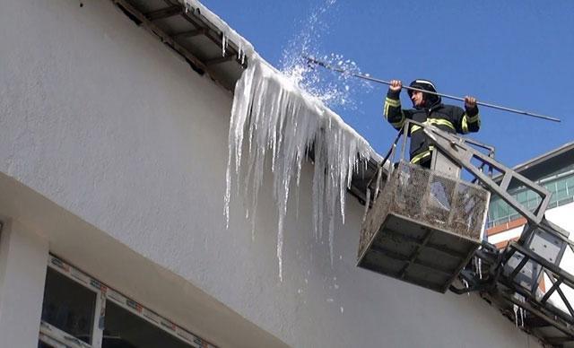 Çatılarda oluşan buz sarkıtlarının tehlikeli olduğunu belirten Halit Baysal, itfaiye ekiplerinin tehlikeyi ortadan kaldırdığını belirtti.