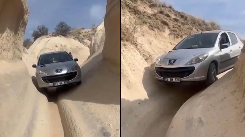 Türkiye’nin önemli turizm merkezlerinden olan Kapadokya bölgesini ziyarete gelen sürücü, navigasyonun yanlış yönlendirmesi sonrası taşıt trafiğine kapalı yola girip, peri bacalarındaki kayalıklar arasında ilerledi. O anlar, cep telefonu kamerasına yansırken, görüntüler de sosyal medyada gündem oldu. Vadide kayalıkların içerisinde ilerleyen sürücü, "Bütün turistlere gösterdim. Düştüğü kuyudan nasıl çıkarılır adlı çalışmam" paylaşımında bulundu.