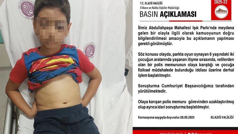 Olay, Abdullahpaşa Mahallesi’nde bulunan Işık Parkı’nda meydana geldi. Parkta oyun oynayan 6 yaşındaki iki çocuk arasında çıkan itişme sırasında, çocuklardan birinin babası olan polis memurunun diğer çocuğa fiziki müdahalede bulunduğu iddia edildi. Olayın ardından çevrede tepki oluştu. Elazığ Valiliği’nden yapılan yazılı açıklamada olaya ilişkin idari soruşturma başlatıldığı, polis memurunun ise görevinden uzaklaştırıldığı belirtilerek, “İlimiz Abdullahpaşa Mahallesi Işık Parkı’nda meydana gelen bir olayla ilgili olarak kamuoyunun doğru bilgilendirilmesi amacıyla bu açıklamanın yapılması gerekli görülmüştür. Söz konusu olayda, parkta oyun oynayan 6 yaşındaki iki çocuğun aralarında yaşanan itişme sırasında, velilerden olan bir polis memurunun olaya karıştığı ve çocuğa fiziksel müdahalede bulunduğu iddiası üzerine derhal işlem başlatılmıştır. Soruşturma Cumhuriyet Başsavcılığımız tarafından yürütülmektedir. Olaya karışan polis memuru görevinden uzaklaştırılmış olup ayrıca idari soruşturma başlatılmıştır” denildi.