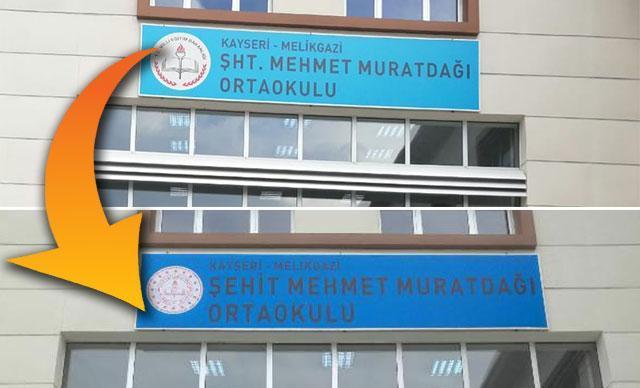 KAYSERİ'de, Şehit Mehmet Muratdağı Ortaokulu'nun tabelasında yer alan 'şht' kısaltması, Vali Şehmus Günaydın'ın talimatıyla 'şehit' olarak değiştirildi.
