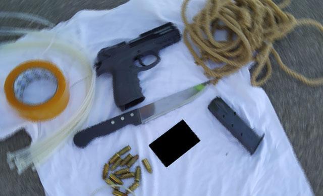 M.A.'nın yapılan üst aramasında, 9 milimetre çapında tabanca, bu silaha ait 14 mermi, 28 santimetre uzunluğunda bıçak, 10 plastik kelepçe, 1'er metre olarak kesilmiş, uçları düğümlü 5 kendir ip ve koli bandı ele geçirildi.