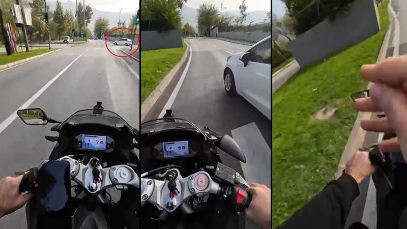 Bursa’da bir motosiklet sürücüsü, kırmızı ışıkta geçip önüne manevra yapan otomobilin dikiz aynasını kırdı. O anlar kask kamerasına yansıdı.