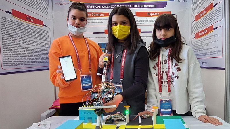 Erzincan'da görme engellilerin kent yaşamında karşılaştıkları zorlukları gören Demirkent TOKİ Ortaokulu 6'ncı sınıf öğrencileri Naz Yüksel (12), Meva Tuana Yalçınkaya (12) ve Zeynep Bali (12), bilişim teknolojileri öğretmenleri İnan Akyol'un danışmanlığında 'Görme engelliler için sesli sarı yürüyüş yolları sistemi ve akıllı baston' projesi hazırladı. 3 bölümden oluşan projede öğrenciler, takip ve yönetim süreçlerinde anlık veri sağlayan RFİD kartlar üzerine 3D yazıcıdan baskısı alınan sarı yürüyüş yolları, trafik ışıkları ve binaların olduğu şehir modeli hazırladı. Mesafe sensörü, pil ve butonla akıllı baston yapan öğrenciler, projenin sonunda ise akıllı baston ile kablosuz iletişim kuran mobil uygulamayı gerçekleştirdi.
