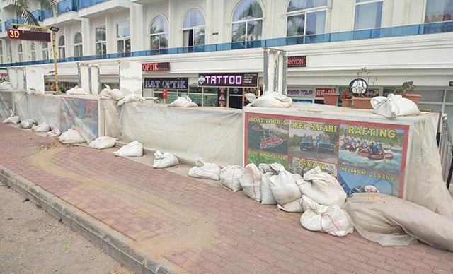 Afet ve Acil Durum Yönetimi Başkanlığı'nın (AFAD) Antalya ve genelinde çok kuvvetli yağış beklendiğini belirterek yaptığı uyarının ardından birçok işletme önlem almaya başladı. Manavgat ilçesi Evrenseki Turizm Merkezi'ndeki 5 yıldızlı otelin çalışanları, her sağanak sonrası yaşanan su baskınlarına karşı önlem aldı. Otelin bahçe duvarı naylon brandayla kapatılıp önünü de kum torbaları yerleştirildi. Otel yetkilileri, aşırı yağış uyarısının ardından her zaman önlem aldıklarını belirterek daha sonra branda ve kum çuvallarını topladıklarını söyledi.