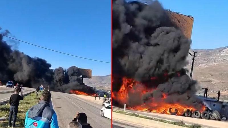 Oto lastikçide çıkan yangın nedeniyle kara yolunda ulaşım aksadı