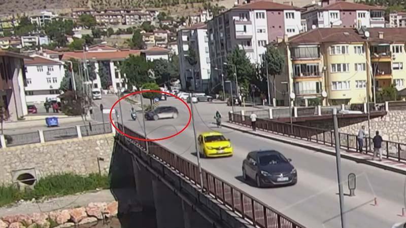Amasya'da otomobil ile çarpışan motosikletin sürücüsü Ebru O. (37) ve yanındaki çocukları Ebru O. (10) ile Kerem O. (13) yaralandı. Kaza, güvenlik kamerasına yansıdı.