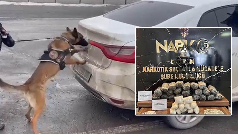 Erzurum’da şüphe üzerine durdurulan otomobilde narkotik arama köpeği Hera ile yapılan aramada 23 kilo 250 gram skunk ve 11 kilogram metamfetamin ele geçirildi, olayla ilgili 2 şüpheli tutuklandı