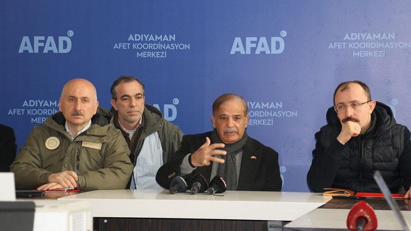 Pakistan Başbakanı ahbaz Şerif, depremin etkisini yerinde incelemek amacıyla Adıyaman'a geldi. Adıyaman Havalimanı'nda, Ulaştırma ve Altyapı Bakanı Adil Karaismailoğlu ile Ticaret Bakanı Mehmet Muş tarafından karşılanan Pakistan Başbakanı Şerif, bakanlarla birlikte, Atatürk Bulvarı'ndaki Pakistan Arama Kurtarma ekiplerinin bulunduğu çarşı merkezine gelip incelemelerde bulundu. Sharif, burada depremzedelerle de bir süre sohbet etti. Beraberinde 1 kargo uçak malzemelerle gelen Şahbaz Şerif,, daha sonra Adıyaman Üniversitesi Afet Koordinasyon Merkezi'nde düzenlenen toplantıda Bakan Karaismailoğlu ve Bakan Muş ile basın açıklamasına katıldı.