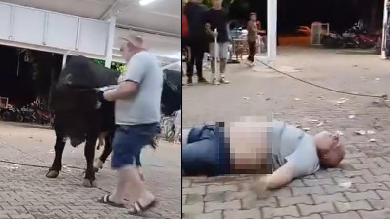Muğla'nın Menteşe ilçesinde bir boğanın, güreş öncesi düzenlenen eğlencede para atmak için yanına gelen Halil Yetimoğlu'nu boynuz darbesiyle havaya fırlattığı anlar, çevredekilerin cep telefonu kamerasıyla kaydedildi.