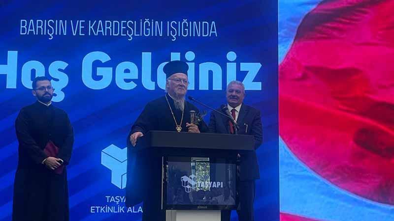 Programda, Taşyapı Yönetim Kurulu Başkanı Emrullah Turanlı, Rum Ortodoks Patriği Bartholomeos’a zeytin işlemeleriyle süslenmiş el yapımı bir sanat eseri hediye etti. Bartholomeos ise “Benim köyüm Gökçeada’da, küçük Zeytinli Köyü” diyerek karşılık verdi.