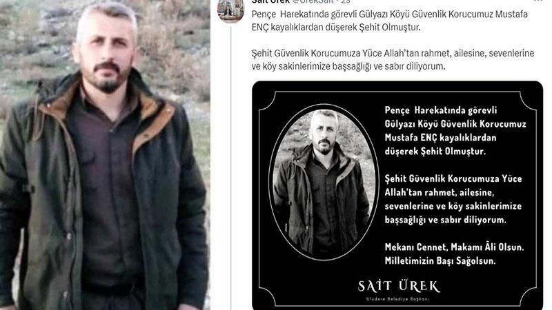 "Pençe Harekatı’nda görevli Gülyazı Köyü güvenlik korucumuz Mustafa Enç, kayalıklardan düşerek şehit olmuştur. Şehit güvenlik korucumuza yüce Allah’tan rahmet, ailesine, sevenlerine ve köy sakinlerimize başsağlığı ve sabır diliyorum."