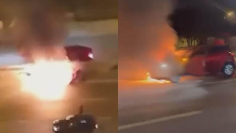 Yangın, saat 00.00 sıralarında D-100 Karayolu Pendik mevkii Ankara istikametinde seyir halindeki otomobilde çıktı. İçinde 5 kişinin bulunduğu otomobilin motor kısmından bir anda dumanlar yükseldi. Durumu fark eden sürücü, aracı hemen emniyet şeridine çekerek yanındakilerle birlikte dışarı çıktı. Kısa sürede büyüyen alevler tüm aracı sararken, çevredekilerin ihbarı üzerine olay yerine itfaiye, sağlık ve polis ekipleri sevk edildi. Yangın, itfaiye ekipleri tarafından söndürülürken, otomobil demir yığınına döndü. O anlar diğer sürücülerin cep telefonu ile kaydedildi.