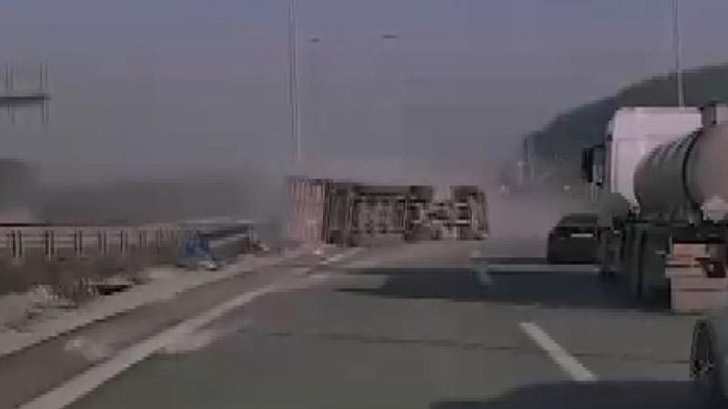 Kaza, dün saat 13.00 sıralarında TEM Otoyolu, Kuzey Marmara Otoyolu yol ayrımında meydana geldi. Otoyoldan hızla bağlantı yoluna giriş yapan TIR virajı alamayarak devrildi. TIR'ın arkasındaki araçlar ise kaza yapmaktan son anda kurtuldu. O anlar aynı istikamette ilerleyen başka bir otomobilin araç kamerasıyla kaydedildi.