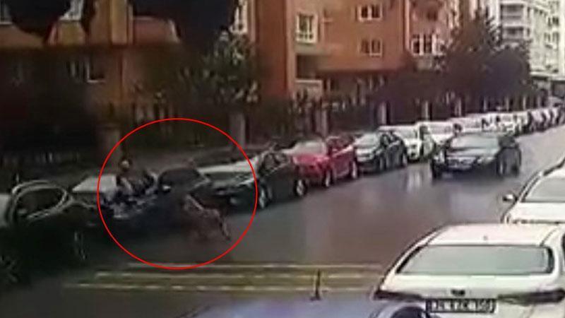 Maltepe'de önceki gün sokakta yürüyen yaya, bir pitbull ile sokak köpeğinin saldırısına uğradı. Yaralı mahalle sakini, köpeklerden kurtulmak için park halindeki bir otomobilin üzerine çıktı. O anlar güvenlik kamerasına yansıdı.