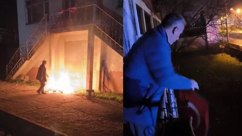 Düzce'de polis ekipleri, metruk bir bina önünde ateş yakıldığı ihbarı üzerine gittikleri adreste yanma tehlikesi olan Türk bayrağını zarar görmemesi için güvenli yere aldı.