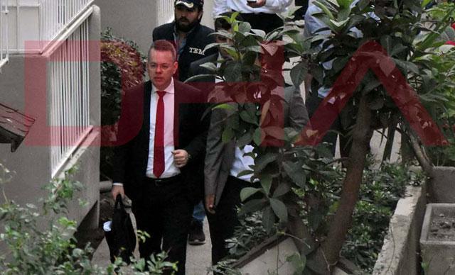 Rahip Brunson, elinde duruşma evrakının olduğu düşünülen çanta ile yanındakilerle konuşarak doğrudan evine girdi. Brunson'ın evinin balkonunda, uzun süre önce asılan Türk bayrağının hâlâ durduğu görüldü.