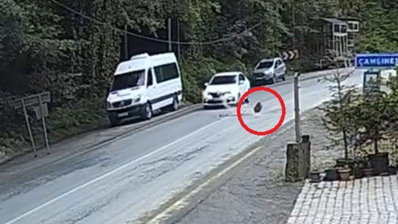 Olay öğleden sonra Çamlıhemşin ilçesi Ayder Yolu’nda meydana geldi. Yamaçtan kopan kaya parçası yola düştü. O esnada yoldan geçen bir otomobil, kayaya çarpmaktan son anda kurtuldu. Kısa süreli panik yaşayan sürücü yoluna devam ederken, o anlar güvenlik kamerasına yansıdı. Görüntüde yamaçtan kopan kaya parçasının hızla yola düştüğü, o esnada yoldan bir otomobilin geçtiği görüldü.