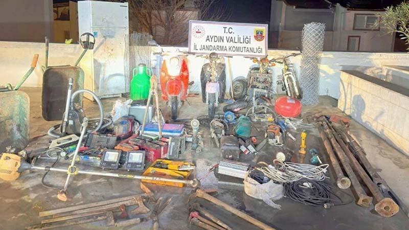 Kuşadası İlçe Jandarma Komutanlığı ekipleri, 22 Aralık'ta ilçede etkili olan sağanakta su baskını nedeniyle boşaltılan Güzelçamlı Mahallesi’ndeki 4 evden hırsızlık yapılması üzerine çalışma başlattı. Ekiplerin incelemesinde, hırsızlık şüphelisinin R.A. olduğu tespit edildi. Dün operasyon düzenleyen ekipler şüpheliyi kaldığı evde gözaltına aldı. Evde yapılan aramada 9 akü, boru kaynatma makinesi, inverter, 2 el arabası, çim biçme makinesi, 2 bahçe aydınlatması, 2 testere, araç yıkama makinesi, uydu alıcısı, televizyon, hidrofor, 2 araç teybi, 3 kapasitör, reaktör bobini, su pompası, 4 iskele demiri, rezervuar tertibatı, 3 elektrikli motosiklet, bisiklet, bahçe teli, su ısıtıcısı, buzdolabı, 2 elektrikli süpürge, 2 spiral makinesi, şarjlı dal budama testeresi, şarjlı lamba, 2 el testeresi, 2 orak, 3 plastik boru makası, çalı biçme makası, boru anahtarı, 3 keser, 3 balta, 2 çapa, çelik tel kesme makası, elektrik kablosu, takım çantası, 3 plastik boru, 3 helezon boru, 2 bong aparatı ve 13 kurusıkı fişek ele geçirildi.