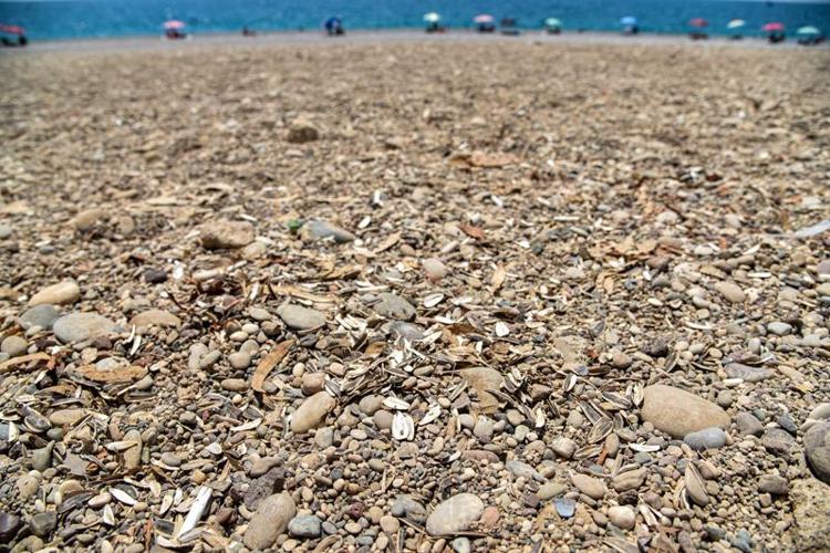 Antalya'da sıcak havalarda denize girip, serinlemek isteyenlerin yoğunluk oluşturduğu Konyaaltı Sahili'nde söndürüldükten sonra çakıl taşları arasına gizlenen, yere atılan izmaritler, kuru yemiş ile midye kabukları kirliliğe neden oldu.