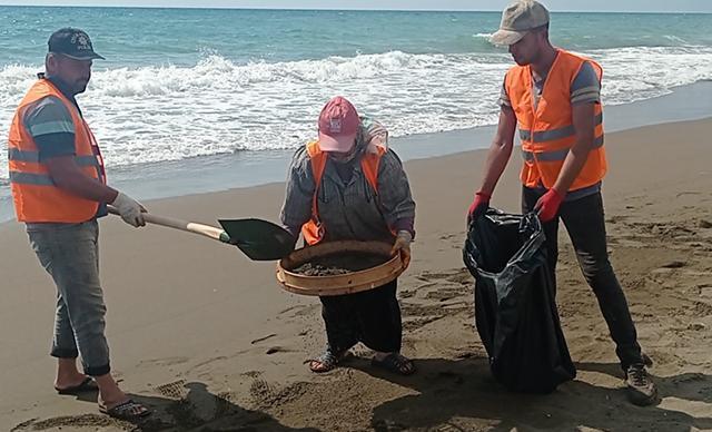 Samandağ sahilınde petrol atıkları elekle temizleniyor