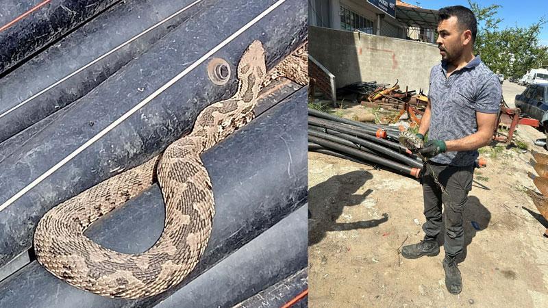 Sanayiye getirilen traktördeki su borusundan zehirli engerek yılanı çıktı
