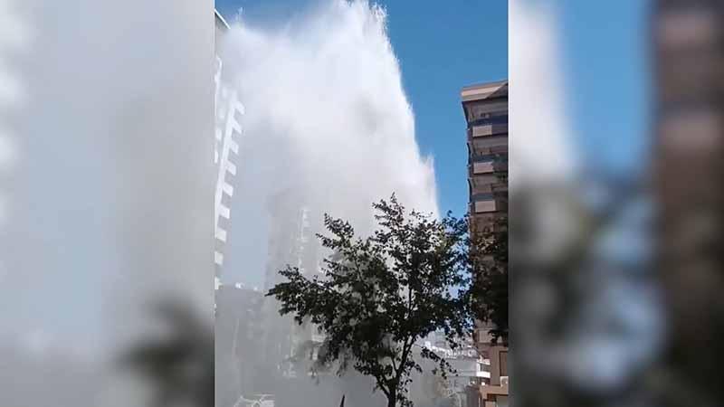 Şanlıurfa'da ana su şebekesine bağlı su borusu patladı. Borunun patlamasıyla suyun metrelerce yükseğe fışkırdığı anlar, cep telefonuyla görüntülendi.