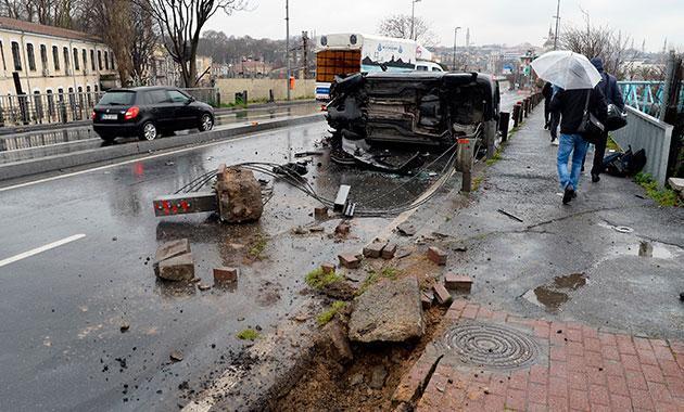 Fatih'te sahil yolunda bir otomobil, yağış nedeniyle kayganlaşan yolda sürücünün direksiyon hakimiyetini kaybetmesi sonucu yol kenarındaki bariyerlere çarparak takla attı. Büyük çapta maddi hasarın meydana geldiği otomobildeki 1 kişi hafif yaralandı.