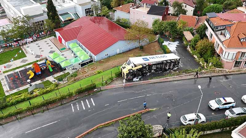 Sarıyer'de caddede şoförünün direksiyon hakimiyetini kaybettiği bisküvi yüklü TIR devrildi. Kazada hafif yaralanan sürücü vatandaşlar tarafından TIR'dan çıkarılarak ambulansla hastaneye kaldırıldı. Kaza sırasında TIR'ın devrildiği alana yakın noktadaki çocuk parkında Sarıyer Belediyesi'ne ait bir okulun açılış etkinliği olduğu öğrenildi. Kaza anı güvenlik kamerasına saniye saniye yansıdı.