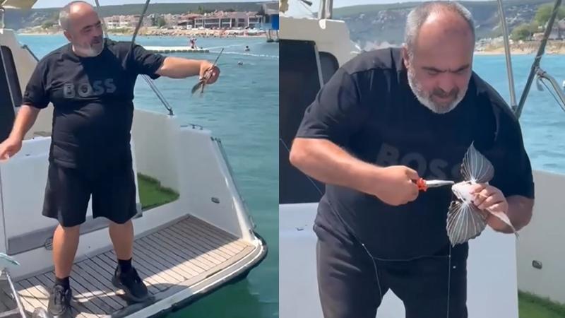 Edirne'nin Saros Körfezi'nde nadir görülen kırlangıç balığı, turizm işletmecisi Mustafa Altunhan'ın oltasına takıldı.