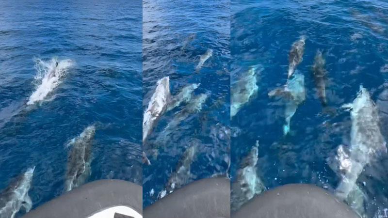 Saros’ta teknenin yanında yüzen yunus sürüsü kamerada
