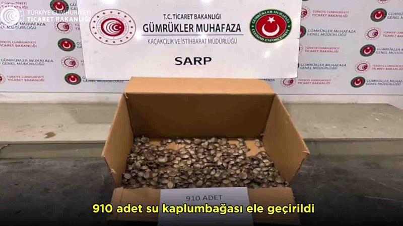 Ticaret Bakanlığı, Sarp Gümrük Kapısı'nda kaçak yollarla yurda sokulmak istenen 910 su kaplumbağasının ele geçirildiğini açıkladı.