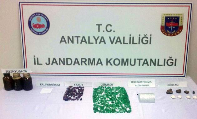 Antalya'nın Serik ilçesinde jandarmanın tehlikeli madde kaçakçılığı operasyonunda piyasa değeri yaklaşık 23 milyon dolar olduğu değerlendirilen zenginleştirilmiş alüminyum, zümrüt, yakut, göktaşı ve Selenyum-74 maddesi ele geçirildi. Olayla ilgili 3 Afgan ve 3 Türk tutuklandı.